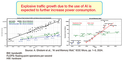 AbstractThis article presents a discussion on the forefront of photonics-electronics convergence technology, which is based on a technical seminar conducted at the “NTT R&D FORUM 2024 - IOWN INTEGRAL” held from November 25th to 29th, 2024. Keywords: photonics-electronics convergence, optical interconnect, supercomputer 1. Presentation 1Membrane III-V photonic devices for in-package optical interconnectsMatsuo: One of the goals of NTT’s research on optical devices is reducing power consumption. The use of information and communication technology (ICT) equipment is rapidly increasing worldwide, and with the spread of cloud services and artificial intelligence (AI), datacenters are becoming larger. One large-scale datacenter requires as much electricity as generated by one nuclear power plant, and datacenters account for 2% of global electricity consumption. In Japan, concentrated in the Tokyo metropolitan area, datacenters account for 12% of Japan’s electricity consumption. NTT uses—mainly for communications and computers—0.7 to 1% of total electricity demand in Japan, so research and development on reducing power consumption is an urgent task for us. Since my specialty is optical technology, I will briefly review the history of optical technology. Information can be transmitted with two methods: wireless (e.g., mobile phones) and wired. The wired method is classified into two types: electrical interconnects, which send electrical signals carrying information through copper wire, and optical interconnects, which send optical signals carrying information through optical fiber. Electrical interconnects are slower in terms of transmission speed but more cost-effective when transmission distance is short. In contrast, optical interconnects are faster, so they are preferable when transmission distance is long. Optical fiber began to be used in inter-prefectural networks about 40 years ago in Japan, and is now widely used in longer networks such as submarine cable networks. As the processing power of ICT equipment has increased and transmission speeds have increased, it is now becoming more cost-effective to use optical interconnects even over shorter distances, such as in datacenters and supercomputers. In supercomputers, optical interconnects are almost always used for signal link, the distance of which is averaging about 20 m. In light of these circumstances, focusing on optical interconnects inside a package containing a photonics-electronics convergence device, I’ll explain why optical technology is applied not only to communications but also to computing. As the use of AI increases, traffic (i.e., communication volume) is expected to increase, and power consumption will continue to increase accordingly. In the left graph in Fig. 1, the black line represents the increase in computer performance, green line represents the increase in memory capacity, and blue line represents the increase in communication speed. The difference between the slopes of the black and green line is called the “memory gap,” and this memory gap is only getting wider as time progresses. This trend was driven by the use of AI, as shown in the graph on the right in Fig. 1. The number of parameters of Transformer models, shown as the red line, is increasing at an even faster rate than computer performance. Therefore, the amount of electricity required for communications is increasing.