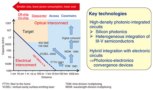 The target of our research and development is to introduce optical interconnects in shorter-distance transmissions where power consumption is high with electrical interconnects (Fig. 2). During this research and development, it is important to consider that devices must be small due to space constrains, and their power consumption and cost must be low. Photonic-integrated circuits satisfy these three requirements. We use silicon photonics, which uses the silicon complementary metal-oxide semiconductor (CMOS) process to fabricate photonic and electronic integrated circuits on silicon. Since compound semiconductors—rather than silicon—are used as materials of transmitters/receivers for the laser light required for optical communications, a technology for the heterogeneous integration is needed. Photonic-integrated circuits fabricated in this manner are then integrated in three dimensions with electronic circuits, creating a photonics-electronics convergence device.