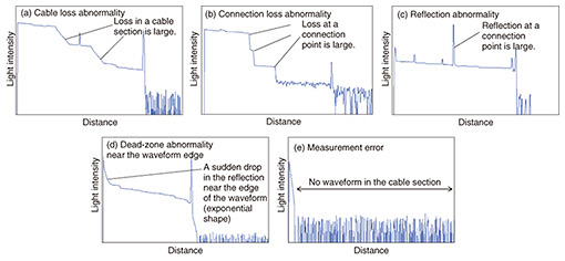 Practical Field Information about Telecommunication Technologies Vol. 23, No. 5, pp. 56–60, May 2025. https://doi.org/10.53829/ntr202505pf1 OTDR Waveform Evaluation Tool Enabling Automatic Identification of Location and Cause of FaultsAbstractAn optical time-domain reflectometer (OTDR) is commonly used to check the condition of optical fiber cables. However, identifying the location and cause of faults in optical fiber cables using an OTDR requires advanced skills and a substantial workload to analyze the obtained waveform. Technical Assistance and Support Center, NTT EAST developed an OTDR waveform evaluation tool to automatically identify abnormal sections in optical fiber cables from waveforms obtained with an OTDR. This article presents an overview of this tool. Keywords: OTDR, waveform analysis, abnormality determination 1. IntroductionOutdoor telecommunication facilities are exposed to harsh natural environments and subject to unexpected faults. To restore these facilities quickly, it is crucial to swiftly and accurately identify the location and cause of the fault. An optical time-domain reflectometer (OTDR) is commonly used to check the condition of optical fiber cables [1]. However, identifying the location and cause of faults in optical fiber cables using an OTDR requires advanced skills and a substantial workload to analyze the obtained waveform. To address this issue, Technical Assistance and Support Center (TASC), NTT EAST developed an OTDR waveform evaluation tool that automatically identifies abnormal sections in optical fiber cables from the obtained waveforms. 2. Problems with OTDR waveform evaluationAn OTDR injects a test light into an optical fiber and measures the intensity of the backscattered and reflected light along the length of the optical fiber cable. Examples of waveforms obtained with an OTDR are shown in Fig. 1. If the loss at a connection point is large, the light intensity will decrease locally at the connection failure location, and a step-like waveform will be observed (Fig. 1(a)). Conversely, if the loss in a cable section is large, the light intensity decreases continuously over a certain distance, and the slope of the section with respect to distance increases, as shown in Fig. 1(b). Therefore, by analyzing the waveform with an OTDR, the location and cause of faults in optical fiber cables can be estimated.