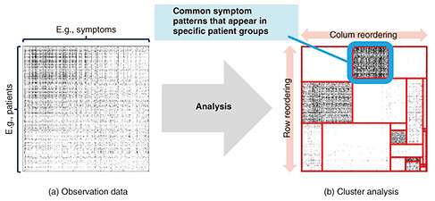 Feature Articles: Exploring Humans and Information through the Harmony of Knowledge and Envisioning the Future Vol. 23, No. 10, pp. 73–77, Oct. 2025. https://doi.org/10.53829/ntr202510fa10 Discovery of Hidden Knowledge in Data Relationships—Prospects for Reliable Healthcare through Infinite-hypothesis AI Models That Interpret Biological PhenomenaAbstractVarious analyses of biological information data have led to the discovery of numerous insights that contribute to the advancement of medical healthcare. However, the use of artificial intelligence in fields closely related to human life and health has drawn attention to the important issue of evaluating risks and uncertainties, particularly in analysis, prediction, and decision-making. This article explains a machine learning method that explicitly captures the risks and uncertainties in data analysis by considering the infinite number of hypotheses that may exist when a model explains biological phenomena. Keywords: medical healthcare, Bayesian machine learning, artificial intelligence 1. IntroductionArtificial intelligence (AI) has become an indispensable part of our lives and is being used in various fields, such as the production of various media including voice, music, images, videos, text, and games, as well as the backend of video streaming services and product recommendation systems. The advancements in large language models and generative AI have been remarkable. The world once depicted in science fiction during the early days of AI—such as a world where humans and AI coexist—is already becoming a reality. In fact, AI is not only demonstrating capabilities on par with humans in addressing many challenges in nature and society but is also, in some cases, surpassing human capabilities. The further development of AI will likely lead to a richer and more convenient life for humanity. What specific directions might the further development of AI take? and what kind of changes will this development bring to our lives in the future? Our research team is focusing on the ability to infer unknown knowledge as one of the important directions for the further development of AI. The term “unknown knowledge” may seem paradoxical at first glance, but it is no exaggeration to say that we, humans, have developed, cultivated, and demonstrated this ability, which has enabled us to evolve into the modern society we live in today. We derive hypotheses from phenomena that occur in the real world and imagine various “unknown” phenomena, treating them as if they were part of our existing knowledge. On the basis of the knowledge and experience accumulated over a long period, we can infer the certainty or uncertainty of unknown knowledge. For example, in the past, infectious diseases and unknown pathogens would cause severe damage to specific regions for long periods once they spread. However, in modern times, even for new infectious diseases and unknown illnesses, useful countermeasures and treatments can be discovered in an overwhelmingly short period (albeit with some degree of risk). Through the accumulation of various experiences over a long history, humanity has developed the ability to make such statistical inferences. However, as history shows, the accumulation of such experience requires an enormous amount of time. Therefore, our research team aims to implement this ability to infer unknown knowledge into AI, thus achieving human-surpassing imagination and high-precision statistical inference, which may bring about significant transformations in our lives. For example, it may be possible to prevent global epidemics and pandemics by predicting the risk of unknown new infectious diseases, or AI may be able to predict and prepare countermeasures against unknown pathogens that may be brought to Earth by extraterrestrial life forms, averting the threat of human extinction. This article focuses on structural hypotheses among the representation forms of unknown knowledge. Structural hypotheses refer to discrete structures that enable the effective and efficient representation of knowledge, such as permutations, partitions, binary trees, Cambrian trees, binary sequences, factor graphs, and rectangle partitions. These are particularly useful as methods for representing unknown knowledge that frequently arises in various bioinformatics challenges with applications in biomedical healthcare. For example, permutations play an important role in ranking and matching tasks and used in the ranking functions of search systems for large-scale data. Partitions are useful in classification and clustering tasks, helping to discover hidden cluster structures within large-scale data. In hierarchical clustering problems, binary trees are used to discover hierarchical cluster structures hidden within data. In phylogenetic-tree-analysis problems, Cambrian trees are used to capture the evolutionary trajectories of biological events such as gene mutations, fusions, and recombinations. Therefore, structural hypotheses are gaining attention as useful tools for revealing unknown knowledge hidden within data. The following sections present AI that uses structural hypotheses as a method for representing unknown knowledge, along with several application examples, methods for generalizing them, and prospects for applications in biomedical healthcare. 2. Relational data analysisMedically unexplained symptoms refer to cases in which patients are aware of some form of physical discomfort but the underlying medical cause cannot be identified, making it impossible to provide appropriate treatment. In Japan, such cases have become particularly prominent since the 1960s. One promising method for interpreting medically unexplained symptoms in a data-driven manner is relational data analysis. For simplicity, we will represent the observational data related to medically unexplained symptoms as a binary matrix, as shown in Fig. 1. This matrix corresponds to patient groups in the
