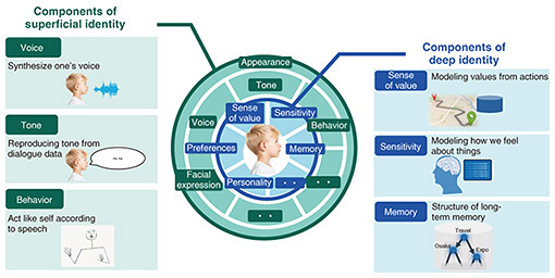 The theme of Room 3 was Another Me™, one of the Grand Challenges [2] of the Digital Twin Computing Initiative proposed by NTT in 2020. Another Me is a digital twin. With Another Me of oneself that can act autonomously, we aim to expand various life opportunities. Another Me in the Virtual NTT Pavilion used the virtual space’s ability to provide content tailored to each user with a high degree of freedom and provided Another Me Planet as a unique application that makes visitors feel closer to the world view of Another Me. The purpose of this application is to expand the possibilities of one’s future by using oneself as a use case and by communicating with Another Me, who has a job in the future that one does not currently have. This article introduces various initiatives for the actualization of Another Me and Another Me Planet. 2. Technologies that make up Another MeIn Another Me, what elements are needed to be able to express oneself? NTT laboratories have been conducting research and development by dividing the elements of “self” into two major layers: deep and surface (Fig. 2). The deep layer is innate or acquired through various experiences and serves as a standard of behavior. We are investigating the structuring of memories on the basis of various experiences, extraction of the axis of values, and extraction of sensibility using brain waves. The surface layer is a way of expressing behavior. In addition to appearance, NTT laboratories are investigating the generation of voice, speech content, and body movement.