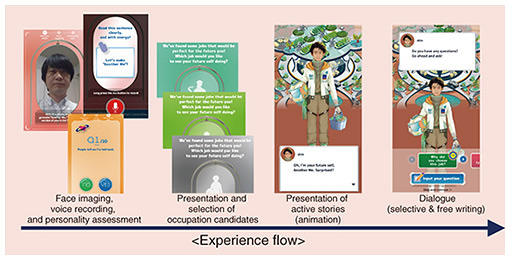 To use the “working self” in one’s life as a use case and to determine one’s potential, Another Me with a job that the user does not currently have but could have in the future will be created. Through interaction with Another Me, people will be able to visualize and realize their potential, which is difficult to do themselves. Figure 4 shows the experience flow of Another Me Planet. The user first takes a photo of their face to generate the appearance of Another Me. To generate the voice of Another Me to sound like the voice of the user, the user is then asked to read a very short sentence that forms the basis of the generated voice. Finally, to give characteristics to the utterances of Another Me, the user answers a questionnaire. On the basis of the above, Another Me with a future job is generated. The user can also ask a variety of text-based questions to this Another Me.