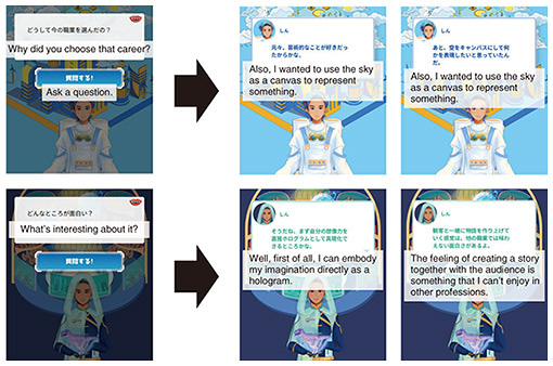 By combining the technologies that make up Another Me, we are demonstrating how to use it in various fields. As a new expression by this alter ego, we have been demonstrating a new expression on the stage by Another Me. We have also been demonstrating support for building relationships in virtual space as support for building human relationships with Another Me. 3. Another Me Planet—an application where one realizes their potential by interacting with their future alter egoAnother Me Planet is an application of expanding one’s own potential by visualizing various possible selves through Another Me. Another Me Planet was exhibited at the Virtual NTT Pavilion so that users could experience the concept of “Through Another Me, people achieve their potential and expand various life opportunities” (Fig. 3).