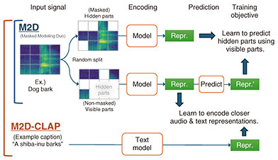 The key to this technique lies in its learning mechanism. The immediate objective is to train the model to produce similar representations for two sounds that differ slightly in their characteristics. But as a byproduct, the learned representations begin to reflect the semantic meaning of the sounds, forming natural clusters based on sound types. This seemingly indirect approach allows the AI to learn “how to listen”—a process like the saying “When the wind blows, the cooper profits.” That is, through what may seem like an indirect mechanism, the model ultimately gains the ability to understand audio in a meaningful way. Here, “semantic meaning of sound” refers to task-dependent sound concepts—for example, whether a sound is a dog’s bark or a musical instrument. The representations learned through this process reflect the inherent characteristics of sounds, enabling the model to form distinct clusters based on the relevant sound concepts for each task. This kind of algorithmic ingenuity is what makes self-supervised learning research so fascinating. 4. Masked Modeling Duo: Learning rich representations through fill-in-the-blank taskIn BYOL-A, learning is driven by introducing variations to the audio input. However, this approach faces limitations in capturing the detailed characteristics of the altered portions of the sound. To address this, we proposed a new self-supervised learning method called Masked Modeling Duo (M2D) [2], which aims to extract features that reflect the essential structure of sound—including subtle variations—by learning through a masked audio prediction in which the model predicts hidden segments of an audio signal (Fig. 3, top). Learning methods that involve predicting masked or future parts of input data have shown great success in natural language processing—most notably in LLMs—and are known to enable the learning of high-quality representations. In M2D, visible parts of the input audio are first encoded into representations, and then these representations are used to predict the representations of the masked parts. For example, when predicting missing segments from a piece of music, the model must learn features that capture musical structure and rhythm. Similarly, when training on various audio types—such as dog barks, musical performances, or ocean waves—M2D learns to extract features that imply the underlying structural patterns of each sound.