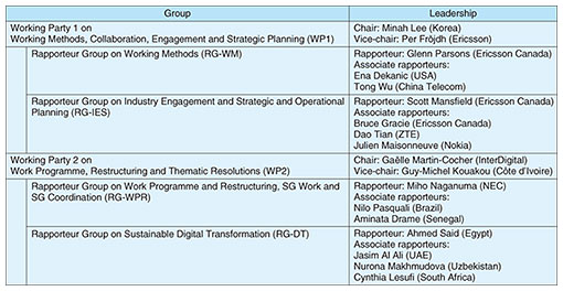 The TSAG chair was Abdurahman Al Hassan of Saudi Arabia, who continued from the previous study period (2022–2024), and in the plenary, a report was made on the new TSAG structure for this study period (2025–2028). Two Working Parties (WPs) were established: WP on Working Methods, Collaboration, Engagement and Strategic Planning (WP1) and WP on Work Programme, Restructuring and Thematic Resolutions (WP2), and two Rapporteur Groups (RGs) were established under WP1: RG on Working Methods (RG-WM) and RG on Industry Engagement and Strategic and Operational Planning (RG-IES), and two RGs were established under WP2: RG on Work Programme and Restructuring, SG Work and SG Coordination (RG-WPR) and RG on Sustainable Digital Transformation (RG-DT) (Table 1). From Japan, Ms. Miho Naganuma of NEC was reappointed as one of the ten vice-chairs and was appointed as the rapporteur of the RG-WPR. Mr. Shigeru Miyake of Hitachi was approved to continue in his role as the liaison officer of the International Organization for Standardization (ISO)/International Electrotechnical Commission (IEC) Joint Technical Committee (JTC) 1.