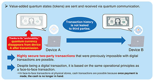 To create this unclonable digital information, I’m conducting research that combines quantum information processing with cryptography. I’m currently focusing on research on unclonable digital currency (quantum money) as an application of quantum information processing (Fig. 3). To date, I’ve proposed methods and related technologies for this digital currency and presented my research findings at major international conferences on cryptography and quantum information, where they have been appraised favorably.