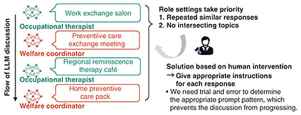 The first issue is that it is difficult for each agent to correct or evolve its opinion throughout discussion. An LLM agent tends to strictly adhere to the given topic and instructions on role and expertise. Once it provides an opinion, it will not change it according to the flow of discussion or responses of others. The result is that each agent expresses similar opinions even after repeated discussions, and a breadth of viewpoints and ideas expected from the MAS cannot be sufficiently achieved. It is particularly important to generate diverse responses that are not simply repetitive or similar to create new value through discussion. The second issue is that points of discussion often do not intersect even if the discussion progresses. Although an LLM can reference the responses of other agents, each agent tends to follow the given instructions only and ignore the opinions of others when generating its response. Responses thus tend to be independent, which prevents the discussion from meshing and makes interactions between agents with opposing views difficult. In particular, agents lack communications such as rebutting the responses of others or deepening the discussion based on empathy, which would naturally occur in human discussions. In short, there is a tendency for discussions to end without reaching a conclusion. These two issues naturally arise from the characteristics of LLMs; thus, they can significantly reduce the value of experiencing a discussion in a participatory workshop. It had been necessary to manually adjust a prompt*3 according to the state of the discussion and instruct an appropriate attitude or viewpoint for each response. This was done to facilitate a concrete discussion while suppressing similar responses and maintaining diverse responses. However, we need to try a number of prompt patterns in a trial-and-error manner. This not only increased the operating burden but also hindered the progress of the workshop; therefore, this approach was not realistic. To cope with such a problem, we need automatic control technology that can achieve diverse responses and a natural discussion simultaneously.