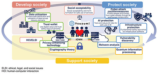 3.1.1 AI security enhancement technologyThis technology enables AI systems to respond to evolving threats. A method for adjusting the AI system (AI model) (alignment) and a method for blocking and controlling inappropriate input/output during the operation of the AI system (guardrail) are effectively combined starting from the safety inspection to enable continuous and timely response. 3.1.2 Vulnerability risk reduction technologyThis technology aims to eliminate the damage caused by exploiting vulnerabilities, from the upstream process of system development to operation. Vulnerability is also a factor in supply chain attacks, and vulnerability countermeasures have become an important issue at the national level since such attacks can bring critical infrastructure to a halt. 3.1.3 Human-centric cybersecurity technologyThis is a technology that evolves security activities from the perspective of the people involved in such activities, centering on collaboration between people and AI. We will create new countermeasure technologies based on the basic premise that both security personnel and end users exposed to threats are people with a mind, which will not only improve security but also improve the experience of security activities. We believe that 20 years of accumulated knowledge and data in the field of cybersecurity will greatly contribute to this research. 3.2 Security R&D for social developmentIn digital transformation, which is expected to be further accelerated due to the evolution of AI, it is important for the owners of diverse digital data in people, organizations, and society to ensure safe distribution and effective use while mutually confirming trust. We are conducting research on digital trust enhancement technologies that enable people to truly rely on information distribution systems and AI. These include technology to control the distribution of digital data throughout its life cycle (generation, distribution, accumulation, utilization, disposal, etc.) on the basis of the wishes of the owners of the digital data and technology to reduce the risk of data leakage and privacy infringement in data processing by enabling different owners of digital data to combine and process them while keeping them encrypted (Fig. 4).