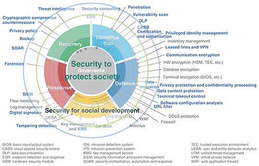 This article presents an overview of our efforts to achieve the above mission and goal from the perspective of security. We have more than 40 years of experience in cryptography research, and cryptography is a fundamental technology to enhance and protect the security of information communications and information management. Over the past 20 years, we have also been focusing on R&D in cybersecurity technologies to address various threats such as unauthorized access, malware infection, distributed denial of service (DDoS) attacks, and phishing. However, I want to emphasize that security technology is not just about protecting. Security technology has the effect of enabling one to do things that one would have previously given up because of unacceptable risk. For example, there are security technologies that lead to the development of society, such as authentication and authorization technologies that enable people who cannot meet in person to verify identity and authority, and secret computing technologies that enable information that is not wanted to be disclosed to others to be used in secret. We are thus anticipating the future and risks posed by information and communication technology, preparing the necessary technologies from the perspective of protecting them, and engaging in R&D to contribute to the development of society by creating various new activities through security. 2. Our environmentAs mentioned earlier, while innovation in information and communication technology contributes greatly to convenience and development, it can also bring about a variety of new problems. I will summarize the current situation and social trends that can lead to such problems. 2.1 Limitations of addressing vulnerabilitiesWith the evolution of software development technology, more and more software is being produced. Naturally, software vulnerabilities (security flaws) disclosed in the National Vulnerability Database (NVD) [1], which is operated by the National Institute of Standards and Technology (NIST) in the United States, are also increasing at an accelerated pace, reaching a level that is no longer easy to deal with. 2.2 AI/LLM abuse and safetyAlong with the development and spread of AI, cyber-attacks using AI have become apparent, such as the discovery of traces of LLM use to develop attack codes [2]. As AI is incorporated into the basis of various systems, concerns about the safety of AI are rapidly spreading. 2.3 Human cognition exposed to attacksConvenient search services and social media can also be a means to efficiently and accurately investigate target people and organizations online. It has thus become possible to efficiently generate and spread sophisticated misinformation and disinformation that affects people’s cognition, and this has become a factor in fraud and social confusion. 2.4 Interest in and expectations for a decentralized societyWhile the development of cloud services has contributed to society moving online, the risks posed by centralized data management have been highlighted. The European Union is actively working to strengthen individual privacy rights and data sovereignty, and there is growing international interest and expectations for individuals to independently manage and control personal information. 2.5 Advent of quantum computersQuantum computers [3] bring new risks, such as decryption of data, as well as diverse applications. Conventional cryptographic methods are widely used and deeply embedded in important systems that support society, and it is not easy to respond to decryption risks without omission. 2.6 Threats and risks at the national levelAll these threats and risks are spreading not only to individuals and companies but also to national politics, economy, and security, as well as to supply chains across countries. 2.7 Weak security personnel structureThe above situation may further increase the responsibility and importance of security personnel, and their mental and physical burden and tension may exceed the appeal of security work. It may thus become difficult to attract new personnel, making it difficult to maintain the security system. In response to any of these trends, it is necessary to mobilize all efforts not only from the technical side but also from a variety of other aspects to cope with risks. We believe that it is vital to research and develop security technologies from the perspective of creating a better future, rather than focusing solely on reducing such risks. 3. Our effortsHere is an overall map of the major research topics we at NTT Social Informatics Laboratories are focusing on (Fig. 2). This diagram maps our research themes to governance, identification, protection, detection, response, and recovery, which are the categories of security activities defined in the NIST Cybersecurity Framework 2.0 [4]. On the basis of this framework, we are conducting R&D with the idea that we will prepare the necessary technologies from the viewpoint of protection and at the same time, we will contribute to the development of society by enabling the creation of various new activities through the improved security with these technologies.