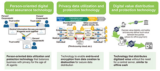 3.2.1 Person-oriented digital trust assurance technologyIn the era of Web3, decentralized identifier/verifiable credential, and AI agents, this technology is a data utilization and protection technology oriented toward individuals that balances business and privacy. Specifically, we grant credentials to people, AI, goods, and data to guarantee and distribute trust. We aim to create technologies that contribute to the foundation of next-generation digital trust in a world where many chains and legacy webs exist. 3.2.2 Privacy data utilization and protection technologyThis technology supports the proper protection and active use of privacy data throughout its creation, use, and destruction, in response to the current situation in which a large amount of privacy data is created daily through various economic and social activities. Even in situations where privacy data spans various organizations, countries, and entities, this technology enables robust data protection and flexible distribution and utilization by creating a virtually integrated end-to-end encryption space on IOWN. 3.2.3 Digital value distribution and protection technologyThis technology distributes digital value such as electronic cash and value information. Like the cash we use offline, we aim to distribute new electronic value without the need for a central server. We are also engaged in R&D in the humanities and social sciences, such as legal systems and privacy. We are thus working to deliver our R&D results to society through both technological development and institutional development. 3.3 Security R&D to underpin next-generation technologiesWe are also engaged in theoretical research that will underpin next-generation technologies 10 to 20 years from now with the aim of continuously creating world-class basic information security technologies. We have world-leading achievements in that a number of our research results have been continuously adopted in prestigious international conferences and journals. We serve as a center of excellence in theoretical research on cryptography and security. 3.3.1 Post-quantum cryptographyWe will drive the safety and security of society by investigating cryptography that cannot be broken by quantum computers (post-quantum cryptography (PQC)). In addition to analyzing the safety and ease of implementation of specific parameters, we aim to establish a cryptographic theory that can achieve both efficiency and composition on the basis of simpler safety assumptions. 3.3.2 Quantum information processing security technologyBy fusing cryptography and quantum information processing, we will promote the creation of pioneering security technologies that can only be created by quantum information processing using physical phenomena unique to quantum environments. 3.3.3 Cryptographic primitive protocol construction theoryOn the basis of cryptographic theory that enables universal and efficient configuration, we will contribute to the timely provision of safe, convenient, and efficient services by providing cryptographic primitive protocols that are optimal for services in socially important and promising fields. 3.3.4 PQC migrationWe are researching and developing technologies to enable us to appropriately and efficiently implement the transition from conventional cryptography to PQC so that people and society will not suffer disadvantages toward the practical application of quantum computers that we will face in 2030. We are also working to standardize the technologies we have created, with the aim of expanding NTT cryptography worldwide. 4. Future developmentsToward the spread of IOWN and the AI-driven society, we will advance security R&D to develop technologies for social development and protection, as well as R&D to underpin next-generation technologies, to make information and communication technology useful for people and not burden with disadvantages. In our R&D activities, we intend to create technologies that are welcomed by society and have real value to people and society while organically linking our research activities and engaging in dialogue and verification with the NTT Group and external partners. We strive to become the source of the advancement in and differentiation of the NTT Group’s security technologies and cooperate with various partners to promote an affluent society where everyone can live in their own way through the safe and fair use of information. References