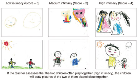 However, when we analyzed the language skills of the same (firstborn and secondborn) children at the ages of 8 to 9, we found no significant difference between the language skills of the children, suggesting that the older sibling effect in language development disappeared during childhood (Fig. 1). We believe that the reason for the disappearance of the older sibling effect is that while 4- to 5-year-olds have more opportunities to interact with caregivers at home, 8- to 9-year-olds (who have started elementary school) have more opportunities to interact with people outside the house such as friends and teachers. This increased interaction with outside people after starting elementary school has a more substantial influence on the secondborn child’s language development. Previous studies did not analyze the older sibling effect during the childhood period; therefore, our findings are the first to report the phenomenon of this effect in language development disappearing in childhood [2]. We are also exploring other topics related to child language development. For example, it is said that if children with hearing problems from birth undergo surgery to fit them with cochlear implants before the age of 2, they will be able to acquire spoken language properly. In collaboration with a team at Shizuoka Prefectural General Hospital, we are currently working on a project to analyze the language development of children with cochlear implants. We are analyzing the vocabulary development of Japanese children raised in institutional care (IC), confirming that IC children aged 0–2 do not exhibit a delay in vocabulary development compared with children raised in biological family care. However, children who have experienced adversity tend to have a slightly more limited vocabulary than those who have not [3]. To clarify the developmental process of reading and the mechanisms underlying dyslexia (i.e., a reading disorder), we are currently conducting extensive surveys on hiragana (a phonetic writing system) reading across multiple regions throughout Japan. Children in some areas exhibit a significant delay in reading hiragana; therefore, we are investigating the possible factors that cause this regional difference. As I mentioned earlier, in collaboration with Hamamatsu University School of Medicine, we are analyzing the language development of children with autism spectrum disorder (ASD). We are using machine learning techniques to investigate a method for predicting the likelihood of a diagnosis of ASD based on the characteristics of a child’s vocabulary development at 14 months of age [4]. Applying the above evidence, we aim to develop a highly accurate method for assessing language development in infants and young children and theorize the individual differences in language development among children who exhibit diverse developmental patterns. These tools will enable the prediction of development, identify children who are likely to experience difficulties in language development at an earlier stage, and propose optimal learning methods tailored to each individual’s cognitive characteristics. It will thus be possible to provide individually optimized support of language development. —You are researching friendship in combination with drawing, correct? Drawing is a significant activity in early childhood. Everyone loves drawing when they are young. In collaboration with nursery school teachers, we are conducting research on whether children’s drawings express intimacy with others. This research aimed to develop a simple method for measuring the relationships between children on the basis of their daily activities at nursery schools. First, children in a nursery were asked to draw a picture of themselves with another child, who was assigned by teachers in a manner that enabled them to draw children with various levels of intimacy with themselves. The teachers at the nursery were asked to rate how often the children played together on a 5-point scale, and the assigned rating was used to measure the intimacy between two children. A total of 832 children (aged 3 to 6 years old) from 21 nurseries participated in the study, and each child was asked to draw one picture (containing themselves and the other child). The distance between the drawing of themselves and the drawing of the other child was measured and taken as an index of intimacy. Several measurements were taken, and the distances that correlated most strongly with intimacy were twofold: (i) the distance between the closest points of the two figures in the picture, and (ii) the distance between the centers of the two heads of the figures or the centers of the whole figures in the picture. In other words, when children draw themselves and a child they often play with, they position both figures (or faces) closer together, whereas when they draw a child they rarely play with, they position the figures further apart [5] (Fig. 2).