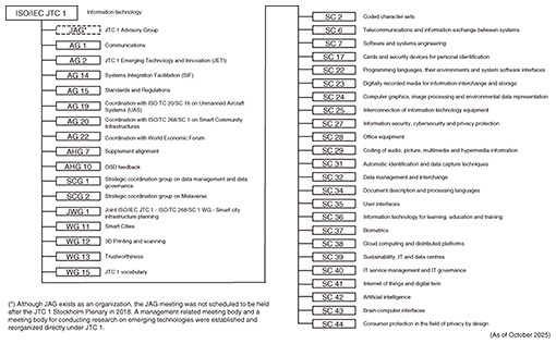 Global Standardization Activities Vol. 23, No. 11, pp. 86–89, Nov. 2025. https://doi.org/10.53829/ntr202511gls Technical Trends in ISO/IEC Joint Technical Committee 1AbstractThe International Organization for Standardization (ISO)/International Electrotechnical Commission (IEC) Joint Technical Committee (JTC) 1 is an organization established by ISO and IEC and is responsible for international standardization in the field of information technology. This article introduces the activities being addressed by subgroups directly under JTC 1, which were identified in resolutions from recent ISO/IEC JTC 1 Plenaries. Keywords: ISO/IEC JTC 1, Plenary, Advisory Group 1. IntroductionThe International Organization for Standardization (ISO)/International Electrotechnical Commission (IEC) Joint Technical Committee (JTC) 1 [1] was established by ISO [2] and IEC [3] and is responsible for the international standardization of information technology. Formerly, ISO/Technical Committee (TC) 97 (established in 1960) and IEC/TC 53 (established in 1961) independently promoted standardization activities in the information-technology field, resulting in the duplication of certain technical fields between these organizations [4]. JTC 1 was established in 1987 to solve this problem. The secretariat of JTC 1 is the American National Standards Institute (ANSI). As of October 2025, JTC 1 comprises 49 P-members (active participants) and 57 O-members (observers). The Plenary is JTC 1’s highest decision-making meeting, and the main agenda is as follows: