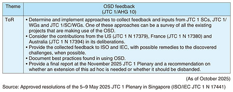 3. Latest trends in JTC 1 subgroups3.1 Launch of SC on consumer protection by privacy by designAs shown in Fig. 1, SC 44 (Consumer protection by privacy by design) is the most recently established within JTC 1. The establishment of SC 44 originated by a proposal from ISO/COPOLCO (Committee on consumer policy) to convert ISO PC (Project Committee) 317, which handles ISO 31700 series (Privacy by design for consumer goods and services), into a TC to maintain these documents. In response to this proposal, ISO/TMB (Technical Management Board) decided to transfer the responsibility to JTC 1 rather than establishing a new TC within ISO and recommended that JTC 1 establish a new SC to allocate ISO 31700 series within JTC 1. At JTC 1 Darwin Plenary in May 2024, there was a great deal of discussion regarding the organizational structure following this recommendation. Japanese NB proposed that the activities related to consumer privacy should be allocated to the current SC 27 (Information security, cybersecurity and privacy protection) rather than creating a new SC, with concerns about the dispersion of experts related to privacy. As a result of the discussion, the ideas creating a new SC accounted for the majority. At JTC 1 Seoul Plenary in November 2024, a resolution was approved to establish SC 44, including its title and scope as discussed by AHG on shaping the future of consumer protection and privacy topics within JTC 1. Approved by both ISO/TMB and IEC/SMB (Standardization Management Board), SC 44 began its activities with its first Plenary held in April 2025. SC 44 is chaired by Jan Schallaböck (Germany), and the British Standards Institution (BSI) serves as Secretariat. 3.2 Feedback on Online Standards DevelopmentOnline Standards Development (OSD) provides the technical community with a unique and harmonized platform for developing standards online, collaboratively, from the preliminary stage through to publication. Since January 2025, OSD has become the default tool for ISO and IEC standards development. OSD has the advantage that committee members can focus on the content of the draft as ISO/IEC Directives are reflected in the tool and reach consensus easily with their collaborative work. However, issues on OSD have arisen. At JTC 1 Singapore Plenary in May 2025, a resolution was approved for JTC 1 to establish AHG on OSD feedback (AHG 10) to collect and send feedback to ISO/IEC Central Office regarding OSD issues and operational improvements. AHG 10 is chaired by Sal Francomacaro (US), and its Terms of Reference (ToR) is indicated in Table 1.