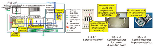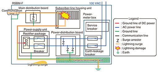 In preparation for the occurrence of higher-voltage lightning surges than that for this failure, installing surge arresters in multiple stages to drain the lightning surge gradually to the ground is also needed. The following three countermeasures were implemented to prevent lightning surges from entering the RSBM-F through power lines. Countermeasure 1: Replace the rectifier package with one that is more resistant to lightning The rectifier package installed in the RSBM-F was replaced with a package with improved lightning resistance (Fig. 5-1). This countermeasure enables the package to withstand a certain level of lightning surge. Countermeasure 2: Install a surge arrester in the power-distribution board to suppress line-to-line voltage A line-to-line surge arrester (countermeasure product: RB-PWN [2] manufactured by Nisshin Electric Co., Ltd.) was installed (Fig. 5-2). This arrester directs lightning surges that would otherwise propagate to the power-supply unit to the ground. Countermeasure 3: Install a low-voltage surge-arrester unit in the power-meter box Low-voltage surge arresters were connected between the power lines and between the power lines and ground line in the power-meter box, and the ground line was connected to the ground terminal board of the RSBM-F (Fig. 5-3). This configuration reduces lightning damage by directing a large lightning surge that enters the RSBM-F from the power lines to the ground. As a result of implementing the above three countermeasures, lightning-surge-induced failure of the RSBM-F no longer occurred. 2.4 Additional countermeasuresAlthough lightning surges entering through communication lines were not the cause of the failure, it is also necessary to prevent possible failures caused by such lightning surges. The propagation route of a lightning surge that enters the RSBM-F through the communication line is shown in Fig. 6. We assumed that a lightning surge that penetrates the communication line will propagate through the main distribution board to the subscriber-line housing unit and damage the subscriber-line packages. It then flows out through the −48-VDC (volts direct current) ground line to the ground terminal board connected to the power-supply unit. The specific countermeasure taken against this type of communication-line lightning-surge damage is as follows.