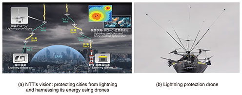 4. Conclusion and future workThis article presented progress at NTT Space Environment and Energy Laboratories on lightning control technologies aimed at eliminating lightning strikes on critical infrastructure and cities, and on lightning charging technologies that harnesses lightning energy. With experiments under actual thunderclouds, we achieved the world’s first success in inducing and guiding lightning using a drone and demonstrated that our lightning protection drones can withstand natural lightning. For lightning charging, we confirmed the feasibility of converting lightning energy from electrical into another form of energy for storage, and specifically into compressed air. Going forward, for lightning control we will accelerate R&D toward practical systems that protect critical facilities from lightning using drones, while advancing (i) lightning induction, (ii) lightning guidance, and (iii) lightning prediction. For (i) lightning induction, improving the success rate is essential for practical use. We will therefore quantitatively analyze the sequence of events that occurs immediately after turning ON the ground potential switch during induction—making use of electromagnetic and fluid simulations—to elucidate the conditions for successful induction. In parallel, we will continue to accumulate successful experimental cases and extract success conditions using an inductive approach. For (ii) lightning guidance, we will pursue further research on lightning-cage design to achieve drones with an even higher lightning tolerance and work with external organizations to address hardware issues expected in practical deployment, such as handling conductive wires and automating drone operations (takeoff/landing, charging/battery replacement, wire attachment). For (iii) lightning prediction, we will research methods for predicting the location and timing of lightning with pinpoint spatiotemporal accuracy. For lightning charging, we will continue to study the compressed-air approach currently under investigation and explore methods for storing charge more efficiently for our future use of lightning energy. References