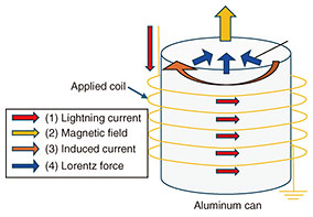3. Status of research on lightning charging technologiesFor lightning guided to intended locations using drones, we are examining methods for effectively harnessing it as energy. However, lightning is a phenomenon in which extremely large currents of hundreds of kiloamperes flow in less than one millisecond, making charging existing batteries impossible. Charging using capacitors—devices with fast response—has also been proposed, but to withstand the large currents and high voltages that accompany them, an enormous number of capacitors must be connected in parallel and series, and each element must be controlled to prevent explosion, resulting in extremely high cost [5]. We are therefore researching technologies that can convert the electrical energy of lightning into other forms of energy for storage. As one example of our basic studies, we present the status of investigations into a method for converting lightning energy into compressed air [6] for storage. 3.1 Fundamental study of lightning charging using compressed airWe examined a method for generating compressed air using lightning in which a metal can is compressed by electromagnetic induction accompanying a lightning surge. The principle is shown in Fig. 4. (1) A lightning surge current is applied to a coil that has a metal can placed inside. (2) A magnetic field is generated inside the coil. (3) An induced current flows on the surface of the metal can in the opposite direction to that of the lightning surge current. (4) The magnetic field and induced current produce an inward Lorentz force on the can, causing it to collapse; thus, compressed air is created inside the sealed can. The generated compressed air is stored using a high-pressure-rated tank. By opening the valve at any desired time, the stored compressed air can drive a turbine, generating electricity. We introduce the results of fundamental tests using artificial lightning surges to generate compressed air.