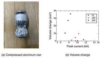 3.2 Feasibility confirmation of lightning charging using compressed airTo determine whether compressed air can be generated using lightning energy and verify the correlation between applied current and amount of compression, we conducted experiments using a lightning surge tester. We fed a lightning impulse current (8/20 μs) into the drive coil and measured the change in volume of an aluminum can placed inside the coil to confirm whether compressed air was generated. We applied voltages of 25, 27.5, and 30 kV and used drive coils with 5, 10, and 20 turns. To quantify the amount of compressed air, we measured the change in volume before and after surge application by filling the inside of the aluminum can with water. Our results using this setup indicate that the aluminum cans were compressed as shown in Fig. 5(a) when the surge was applied, confirming that compressed air can be generated by a lightning surge current. Figure 5(b) plots peak current versus change in volume; the change in volume was proportional to the peak current, and we confirmed that increasing the number of coil turns yielded larger volume changes even at lower peak currents. Since the amount of compressed air increased proportionally with applied current, these results indicate that conversion to compressed air is a valid approach for storing lightning energy.