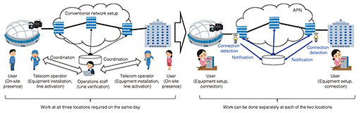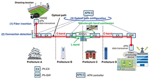 Feature Articles: Toward Commercial Deployment of IOWN APN step3 Vol. 24, No. 1, pp. 33–37, Jan. 2026. https://doi.org/10.53829/ntr202601fa4 Demonstrating Timely Optical Path Establishment Achieved by APN step3AbstractWe are advancing technical studies on All-Photonics Network (APN) step3 to achieve a new connection form that enables users at various locations to connect to the APN only when needed and for the required duration. For the effectiveness and value of this new connection form to appeal to APN users, we have conducted technical demonstrations and use case demonstrations using commercial lines. This article introduces these activities. Keywords: APN step3, optical path establishment, technology demonstration 1. IntroductionIn the Innovative Optical and Wireless Network (IOWN) initiative, the IOWN All-Photonics Network (APN) leverages cutting-edge photonic technology to provide users with high-capacity and low-latency optical paths while minimizing power consumption. This is expected to enable a wide range of applications such as interactive live video streaming services, remote surgeries, and digital transformation in factories. Since the launch of the IOWN APN 1.0 service by NTT EAST and NTT WEST in March 2023, NTT has been conducting various demonstrations that showcase the advantages of the APN’s high-capacity and low-latency characteristics. As an example of IOWN APN step1 and step2 for Enterprise, NTT successfully established a stable and ultra-low-latency connection over approximately 3000 km between Japan and Taiwan using APN technology. As an example of these steps for datacenter exchange, NTT is also advancing APN-based interconnection between datacenters overseas. NTT is now aiming for the next stage—APN step3—which envisions a new mode of APN connectivity where users at various locations can establish on-demand connections to the IOWN APN only when needed and for the required duration, and is studying underlying technologies. To promote the effectiveness and value of the APN, technical demonstrations and use case demonstrations using commercial lines have been conducted. This article introduces these activities. 2. APN step3 technical demonstrationOne notable use case of APN step3 is remote video production, where, instead of producing content on-site, high-capacity and low-latency data transmission enables real-time video production in the cloud or at broadcasting stations. By connecting stadiums or event venues and production centers via the APN, large-capacity, low-latency video collection becomes possible. When providing APN connections to users, it is currently necessary to dispatch technicians to the site to install data transceivers. Technicians at both ends may have to coordinate with network operators who configure APN devices to establish the optical path. For sports broadcasts and live broadcasts from various stadiums and event venues, the APN will be expected to connect between various locations and video production centers. Therefore, it is desirable to set each optical path in a timely manner. To provide optical paths more promptly, it is essential to enable users to simply connect a pre-shipped data transceiver to the APN at their convenience—without the need for on-site technicians—and have the APN automatically detect the connection and configure the optical path (see Fig. 1).