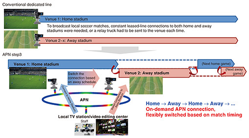 3. Use case demonstration of APN step3 using commercial linesWhile the key technologies of APN step3 were demonstrated in laboratory environments, it is necessary to clarify the application domains of these technologies and indicate their effectiveness through use cases toward the service deployment. The conventional version of the APN has been deployed for providing point-to-point dedicated optical wavelength paths featuring ultra-low latency, large capacity, and low power consumption. In the future, artificial intelligence and real-time processing via the cloud will expand further; thus, connecting a single site to multiple sites will be needed. Achieving such multi-point connectivity using conventional dedicated optical wavelength paths has limitations in terms of flexibility and cost-effectiveness, so the APN needs to become more on-demand in terms of location and time, especially for use cases in which communication between locations is required for a limited period. A specific use case is remote video production collecting large-capacity, low-latency video from nationwide venues for the cloud or broadcast stations (Fig. 4). Such massive video data transmission with minimal latency is key to creating new value in the content creation industry.