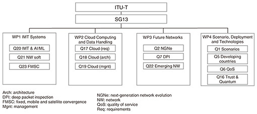Global Standardization Activities Vol. 24, No. 1, pp. 42–45, Jan. 2026. https://doi.org/10.53829/ntr202601gls The Activities of ITU-T Study Group 13 (Future Networks and Emerging Network Technologies)AbstractInternational Telecommunication Union - Telecommunication Standardization Sector (ITU-T) Study Group 13 (SG13) is working on the concept of future networks. Emerging network technologies, such as networks of low latency and energy efficiency, next-generation mobile networks, and quantum information technologies, are being discussed for their implementation around 2030. This article introduces the future network studies in ITU-T SG13. Keywords: future networks, IMT, low latency, energy efficiency 1. IntroductionGlobal standardization community is working toward new network technologies and concepts such as International Mobile Telecommunications (IMT)-2030, quantum information technologies, artificial intelligence/machine learning (AI/ML) and its applications, and cloud computing. International Telecommunication Union - Telecommunication Standardization Sector (ITU-T) designates Study Group 13 (SG13) as the lead SG mandated to progress the work on the concept of future networks as well as necessary coordination among the groups in ITU-T. Experts from telecom operators and vendors as well as academic organizations are involved in the work in SG13. This article introduces the topics of the future networks being discussed at the recent SG13 meetings. 2. Structure of SG13Thirteen Questions, which are small groups tasked to conduct specific study subjects, have been established in SG13. As shown in Fig. 1, these Questions are allocated to 4 Working Parties (WPs), which are the middle level groups between SGs and Questions and have certain authority such as launching approval process of draft recommendations. WP1 is responsible for the study on IMT and allocated 3 Questions. WP2 is responsible for the study on cloud computing and data-handling technologies and allocated 3 Questions. WP3 is responsible for the emerging technologies of future networks and allocated 3 Questions. WP4 is responsible for the study on scenarios, deployment, and technologies of future networks and allocated 4 Questions. In this study period starting from 2025, the structure of Questions is basically maintained as it was in the previous study period until 2024. The number of WPs has been increased from 3 WPs in the previous study period to 4 WPs in the current study period. This change in the WP structure makes Questions of each WP more aligned and will contribute to more efficient technical discussion.