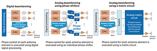 3. Application of optical technology to wireless communicationConventional beamforming methods are shown in Fig. 2. 5G uses beamforming implemented with electrical circuits, but it is thought to be difficult to apply to multiple element array antennas, which are expected to be required for communications using the sub-terahertz band, ranging from several thousand to 10,000 elements. For example, to implement digital beamforming, digital-to-analog converters (DACs) and mixers are required for each antenna element. The amount of signal processing will also increase with the number of antenna elements and beams, so power consumption is expected to increase significantly. Analog beamforming using phase shifters requires a phase shifter for each antenna element, so the number of phase shifters equals the number of beams to be multiplexed, and individual control of the phase shifters are necessary, which are expected to be difficult to integrate with the narrow spacing between antenna elements using the high-frequency band.