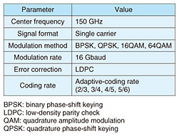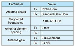 In the signal generator, a laser source is used to generate two optical waves with difference in frequency of 150 GHz, and one of the waves is modulated using an in-phase and quadrature modulator and arbitrary waveform generator. The optical signal phase-weighted by the beamformer is input to the photomixer coordinated with each antenna element and converted into a 150-GHz band radio signal. In the anechoic chamber, a wideband signal (experimental specifications of which are listed in Table 1) was transmitted in each direction from a 2 × 4 element array antenna (specifications of which are listed in Table 2) and received with a horn antenna 30 cm away. To confirm the performance of the beamformer, the received power and throughput of each beam were measured at intervals of 5° from the transmitting antenna. The measurement results for a plane with an elevation angle of −7° from the transmitting antenna are plotted in Fig. 5. The four-color plot, in which the received power of each beam is normalized by its maximum value, and the dashed line showing the array factor (directivity of the transmitted radio wave calculated under the assumption of an ideal beamformer and antenna) corresponds to the right-side vertical axis. As these values increase, the signal-to-interference-and-noise ratio (SINR)*4 becomes higher, and throughput also becomes higher. The solid orange line represents the maximum throughput measured at each azimuth angle and corresponds to the left-side vertical axis. By appropriately switching the selected beam, 64QAM (quadrature amplitude modulation), a high-order modulation method, was selected in all directions, and transmission of over 64.0 Gbit/s was confirmed. We also measured the throughput when multiple beams were transmitted simultaneously. Due to constraints of the experimental equipment, the inner 2 × 2 elements of the 2 × 4 element array antenna were used as the transmitting antenna, and the positions of the two receivers (azimuth, elevation) were respectively (−6°, 19°) and (19°, 19°). Degradation in the SINR due to interference between the two beams was only 0.5 dB, and the maximum transmission throughput for the two beams combined was 136 Gbit/s. The above experimental results validate the principle of the photonics-assisted matrix radio beamformer.