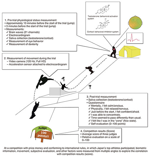 Front-line Researchers Vol. 24, No. 2, pp. 1–8, Feb. 2026. https://doi.org/10.53829/ntr202602fr1 Elucidating the Mechanisms of the Brain and Body of Top Athletes to Improve Their Performance and Ultimately Contribute to People’s Well-beingAbstractTop athletes are able to control their minds and bodies freely under extreme pressure in a way that delivers high performance. Scientifically explaining the underlying mechanisms in the brain and body that underpin this ability not only improves training methods used by athletes but also offers essential insights into how people in general can cope with adversity and improve their well-being. As an NTT Fellow at NTT Communication Science Laboratories and a leading researcher in cognitive neuroscience, Makio Kashino works closely with top athletes from a variety of sports while conducting original on-site measurements of tense and demanding competitions and has thus far uncovered a wealth of groundbreaking findings. In this interview, we asked him to describe his latest progress, share his thoughts on pioneering new research fields, and explain what he keeps in mind in his daily activities. Keywords: sports science, cognitive neuroscience, eye behavior Measuring the brains and bodies of top athletes during actual competitions—Please tell us about the research you are currently conducting. My specialty is the quantitative analysis of the characteristics of human cognition and behavior. I didn’t originally work in the field of sports; instead, I focused on hearing and multisensory perception. Since beginning to focus on sports about ten years ago, I’ve been conducting research in collaboration with top-level sports organizations and athletes. Sports science is mainly related to the body in terms of exercise physiology and biomechanics, for example. In contrast, I’m focusing on the brain. Regardless of the excellence of a person’s body, it cannot function without the brain. Having said that, I believe that the brain cannot be treated in isolation. The underlying idea behind our sports research is that the essence of an athlete’s superior mental and physical skills lies in the interrelationship between their brain and body. My ongoing research can be divided into two themes. One is research into the “technique” component of the three qualities of an athlete, i.e., mind, technique, and body (or strength). In other words, it deals with the mastery of skills. For example, when a batter hits a baseball, a huge amount of complex information is processed in the brain, and the movement of the entire body of the batter is controlled on the basis of information obtained through vision. Understanding the details of this information processing and identifying the strengths of top-level batters will reveal approaches to batting that differ from those that focus on power or form. My other research theme concerns the “mind” component. In other words, mental strength. We often hear stories about athletes performing well in practice but failing under pressure during the actual event due to nerves. Conversely, we also hear about athletes entering “the zone” during the actual performance and demonstrating unexpected strength. If we could comprehend the neuroscientific mechanisms involved in the brain and body—not just mental attitude—during these moments, we might be able to create these ideal states systematically. In conducting this type of research, we place importance on the reality of the experimental situation. Whenever possible, we conduct measurements during actual matches or similar situations. Before we focused on sports, we also conducted experiments under controlled, simple conditions. This approach is typical in basic research, and although it can produce precise results, it is not guaranteed that the knowledge gained can be applied directly to complex, real-world situations. Although it is difficult, one of my motivations for entering this field was the desire to take on the challenge of understanding what is actually happening. Reality applies not only to the experimental environment but also to problem setting. Rather than creating fictitious problems for research purposes, we try to find research topics among the problems faced by athletes and teams. Of course, we filter our findings to see if they are novel from a cognitive-neuroscience perspective and whether they are suitable for analysis, but we want to feed the results back to the athletes. Their livelihoods are at stake, so a paper that shows a significant difference (statistical significance) in isolated factors but a small effect size (lacking practical significance) is meaningless. We were latecomers to the field of sports, and our research in this field was a constant process of trial and error. After ten years, however, we have somehow managed to establish our own research approach, even when viewed from a global perspective. —It is difficult to accurately measure vital signs on-site at a sports event, correct? Since measurements are taken during competition, it would be counterproductive to disturb the athlete in question and cause them to fail. For that reason, we strive to make thorough preparations in terms of, for example, ensuring that the measurement team operates the equipment skillfully, selecting measurement methods that do not interfere with the athlete’s performance, and checking the quality of the measurements. However, on the day of the sports event, the conditions often turn out to be more severe than expected. For example, during measurements at a Big Air snowboarding competition (Fig. 1), we had to quickly set up the measurement tent ourselves in the middle of a snowstorm after the tent company refused to provide one.
