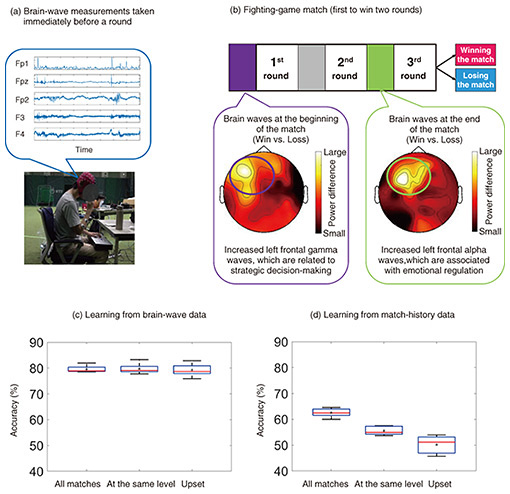 A decent neuroscientist would say that it is impossible to measure multiple parameters, such as brain waves, heart rate, eye movements, and salivary hormones, of over 20 competitors simultaneously in such an environment. Even if we only look at brain waves, anyone with an electroencephalograph can measure some kind of signal, but that signal alone is mostly noise. To measure and analyze at a level of quality that can be published in a scientific journal requires considerable expertise, and it is unlikely that such expertise is readily available anywhere in the world. It is now common to use computer-vision technology to capture motion from video footage; however, standard methods cannot capture the movements of snowboarders performing spectacular tricks in the air. That is because snowboarders’ movements are complex and their clothing tends to be baggy. Part of our research is developing measurement methods for obtaining reliable data for any sports, not just for snowboarding, under harsh conditions. Above all, it is important to build strong relationships of trust with top athletes so they will actively cooperate with us. —Would you also tell us about measurements in other sports? For e-sports, we simultaneously measured the brain waves of both advanced fighting-game players during a one-to-one match. The measurements indicated that the outcome of the match is already decided—to a certain extent—in terms of brain state of the two players just before the match begins. When we examined the players’ brain waves in the eight seconds just before the match (Fig. 2(a)), we found that the areas of activity in the brain differed significantly when the player went on to win or lose the match (Fig. 2(b)). Therefore, when we used machine learning to predict the outcome of the match from this brain-wave data just before the match, its accuracy was approximately 80% (Fig. 2(c)).