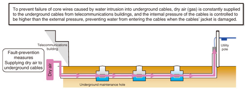 Practical Field Information about Telecommunication Technologies Vol. 24, No. 2, pp. 49–54, Feb. 2026. https://doi.org/10.53829/ntr202602pf1 Effectiveness of a Conduit-sealing Measure against Air Leakage from Conduit SectionsAbstractThis article introduces a measure for sealing the gap between an underground cable and conduit to prevent air leakage from conduit sections. The verification of the measure’s effectiveness in an on-site environment is also described. Keywords: underground conduit, air leakage, inflatable stop valve 1. BackgroundThe cables that provide telecommunications services are laid in underground tunnels, conduits, and maintenance holes as well as carried above ground using utility poles. To prevent failure of the core wires of a metal cable laid in an underground conduit due to intrusion of water, dry air is constantly injected into the cable from a telecommunications building to keep the pressure inside the cable higher than that outside the cable. This prevents water from entering the cable (Fig. 1).