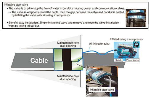 2. Overview of measure for sealing conduitsTo seal a conduit in which a cable is laid, it is necessary to effectively seal the gap between the cable and conduit inlet. Initially, we considered using a foam water-stop material, which reacts with water to expand and fill the gap and thereby achieve a watertight seal. However, once the foam expands and hardens at the conduit inlet, it is difficult to remove, making it difficult to reinstall the foam or cable. When the gap between the cable and conduit is narrow, it is difficult to insert the foam in the short time it takes for it to harden, which poses a challenge to workability. Considering the above issues, we decided to adopt an inflatable stop valve, which is easy to remove and can efficiently fill the gap by inflating the valve with air. Inflatable stop valves are used to stop the flow of water in underground conduits housing power and communication cables (Fig. 3). Their key features are described as follows.