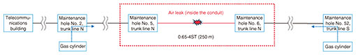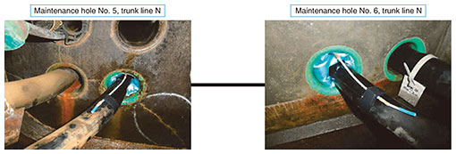 (3) Adequate space exists between the cable and conduit When air is injected into the inflatable stop valve, the valve expands to a certain thickness, and that expansion seals the gap between the cable and conduit in a manner that creates water tightness. However, if the gap between the cable and conduit is insufficient, the valve cannot be correctly fitted in the gap. Even after the valve is expanded, sufficient pressure will not be applied, and water tightness will be insufficient. To avoid such a risk, it is important to accurately measure the difference between the inner diameter of the conduit and outer diameter of the cable in advance and select an inflatable stop valve with the appropriate size. 4. Verification of the measure’s effectiveness in an on-site environment4.1 On-site environmentWe verified the effectiveness of the inflatable stop valve in an on-site environment where dry air was leaking from a section of the conduit between maintenance holes Nos. 5 and 6 in trunk line N, where a 250-m-long cable (0.65-4ST) was laid (Fig. 6).