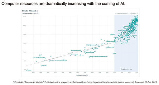 Feature Articles: Keynote Speeches at NTT R&D FORUM 2025ˇ˝IOWN∴Quantum Leap IOWN∴Quantum LeapAbstractThis article presents NTT’s research and development efforts to make quantum leaps. It is based on the keynote speech given by Shingo Kinoshita, NTT senior vice president, head of research and development planning, at the “NTT R&D FORUM 2025—IOWN∴Quantum Leap” held from November 19th to 26th, 2025. Keywords: photonics-electronics convergence (PEC) device, optical quantum computer, generative AI 1. NTT R&D Forum 2025 overviewThe theme of NTT R&D Forum 2025 is “IOWN∴Quantum Leap.” A quantum leap has two meanings. One is a leap forward in quantum mechanics and the other is dramatic progress in business. We aim to achieve a quantum leap in both technology and business. Let me explain why we need a quantum leap. In the current age of artificial intelligence (AI), computation amounts have been dramatically increasing. In Fig. 1, the horizontal axis represents calendar years, and the vertical axis represents computing resources. The area in blue highlights a sharp increase since the beginning of the AI era, meaning that a massive amount of resources is required. For example, for ChatGPT-4, the power consumption required for learning was said to have been about 40,000 MWh. This is equivalent to the power generated by 40 nuclear power plants. Therefore, the largest technological question we must answer globally is “Must computer resources continue to increase in this way toward the future evolution of AI?”