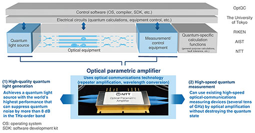 There are three solutions we are investigating to improve the performance of optical quantum computers during these steps. First, the higher the quality of the quantum light source, the larger the amount of high-quality optical quanta (quantum light) can be generated. Second, the more quantum entanglements, the larger the scale of calculations can be executed. Finally, the faster the measurement speed, the faster the calculations can be executed. The actual hardware and software configuration of the optical quantum computer is shown in Fig. 4. Quantum light is first generated from the quantum light source, then quantum entanglements and clusters are generated using optical equipment. Finally, quantum programming and measurements are done using measurement and control equipment. NTT is researching the areas of quantum light sources and measurement/control equipment, where optical parametric amplifiers are used.