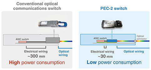 3.2 IOWN optical computingNTT supports the evolving “communications of the future” with “low power consumption through light,” with its IOWN Photonic Disaggregated Computing from both the hardware and software perspectives. In terms of hardware, electrical signals will be replaced with optical signals, reducing power consumption and achieving high-speed communication with low latency. In terms of software, large-scale computers that require advanced processing have traditionally had restrictions on the combination of parts, necessitating the installation of additional cabinets, which consumed power even for parts that were not being used. However, by removing these restrictions and using resource allocation technology that allows for only the necessary functions to be used in the amounts required, we have achieved more advanced processing and reduced power consumption. At Expo 2025 Osaka, Kansai, Japan, these technologies were used for AI-based image processing, enabling resources to be operated only as needed, thus reducing power consumption of up to 1/8 of previous levels. By combining these technologies with the ultra-high-speed All-Photonics Network, it will be possible to use computers in remote locations as if they were a single high-performance computer. This will enable efficient use of electricity near renewable energy sources and power-generation facilities. Optical fiber had been traditionally used for long-distance transmission, such as over 100 km, and electrical wiring for extremely short-distance transmission, such as 10 cm or 1 m, inside servers. However, the required communication speed between graphics processing units (GPUs) for AI computing has increased, and 14 or 15 Tbit/s are now required even at distances of only 10 cm or 1 m. Electrical wiring cannot support such high-speed transmission. Therefore, the technical challenge we now face is how to transmit signals using optical wiring efficiently over distances of 10 cm to 1 m. 3.3 Reduced power consumption in PEC-2 switchWe are working to improve transmission efficiency between boards and prototyped the second generation of a photonics-electronics convergence (PEC) device called PEC-2 (Fig. 6, right). In a conventional optical communications switch (Fig. 6, left), a pluggable transceiver is installed at the front of the switch. After an optical signal enters the transceiver, the signal is transmitted through electrical wiring. The distance between the transceiver and application-specific integrated circuit (ASIC) switch is a short distance of about 300 mm; however, 15-Tbit/s transmission through electrical wiring generates a large amount of heat, increasing power consumption.