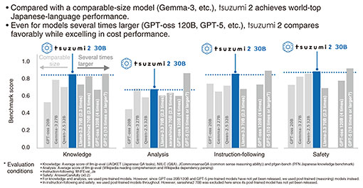 Let us next consider four AI training tasks arrive. For AI training tasks, distributed allocation reduces performance, so the requirement is to allocate them together as much as possible. Therefore, the DCI controller might transfer AI inference tasks running in Fukuoka to Tokyo to free up four GPUs in Fukuoka then assign new AI training tasks there. This kind of optimization is handled by the DCI controller automatically. 4. Gen AI4.1 Release of tsuzumi 2We announced the first version of tsuzumi in March 2024. At that time, the model size was 7 billion (B) parameters. We released the second version in October 2025, the model size of which is 30B. Why 30B? The reason is that this is roughly the maximum model size that can run on a single latest-generation GPU. So why is running on one GPU important? Because it enables on-premise or private-cloud deployment of an LLM at low cost and with high security. There are four features of tsuzumi 2. The first is further improvement in Japanese-language performance. In Fig. 8, the horizontal axis represents the evaluation criteria of LLMs used in Japanese-language benchmark tests: knowledge, analysis, instruction-following, and safety. The vertical axis shows the scores: higher is better. The blue bars are the results for tsuzumi 2. The grey bars show other companies’ models of comparable size, which are, from left, OpenAI’s GPT-oss 20B, Google’s Gemma-3 27B, and Alibaba’s Qwen-2.5 32B. These three models are said to be among the best in the world, yet tsuzumi 2 outperforms them in Japanese-language performance. We also compared tsuzumi 2 with larger-parameter models. These include Meta’s Llama-3.3 70B, SoftBank’s sarashina2 70B, GPT-oss 120B, and GPT-5. GPT-oss is about four times larger than tsuzumi 2, and GPT-5 is estimated to be more than ten times larger, although the exact size is unknown. Even in comparison with these larger models, tsuzumi 2 performs quite well, demonstrating that it is a highly efficient Japanese-language LLM.