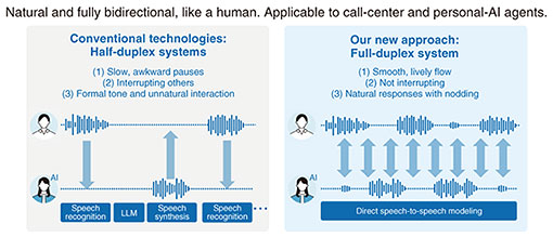 The second feature is improved efficiency in developing specialized models. Rather than aiming it to be a general-purpose model, tsuzumi 2 is designed as a specialized model, so it has been trained heavily on data from fields such as finance, healthcare, and public administration. We evaluated the performance of tsuzumi 2 using the 2nd-grade Certified Skilled Professional of Financial Planning (CSPFP) exam as a financial benchmark. We evaluated how the score changes when the model is given 200, 500, and 1900 practice questions. For Google’s Gemma, the score started at 39 with no practice questions. Only after 1900 practice questions did it reach 64, which is the 2nd-grade CSPFP exam passing line. In contrast, tsuzumi 2 started at 54. It did not reach 60 immediately, but after just 200 practice questions, it reached 70, surpassing the exam passing line. This means tsuzumi 2 reached the required performance level with roughly one-tenth the training data, demonstrating very high efficiency. The third feature is low cost and high security. For example, running DeepSeek 700B requires about 16 units of the NVIDIA H100 GPU, and the hardware cost alone is said to be roughly 100 million yen. In contrast, tsuzumi 2 can run on a single A100 GPU, which is three generations older, and the hardware cost is about 5 million yen. This results in a cost advantage of 10 to 20 times. The fourth feature is that it is a domestically developed AI. From the standpoint of maintaining sovereign AI, which has been gaining attention worldwide, tsuzumi 2 has advantages from the following perspectives: (1) Sovereignty of language and culture (correctly comprehend Japanese and preserve language and culture within the language model) (2) Sovereignty of training data (ensure the model is not trained on data that violate copyright and have full control over what data are selected) (3) Sovereignty of development process (determine the development schedule and methods) (4) Sovereignty of licensing (maintain control over licensing) (5) Sovereignty of technology (enable R&D of AI technology slated to become the key technology of the future without relying on other countries) 4.2 Application of Gen AIConventional conversational AI systems were half-duplex, where the AI speaks and finishes speaking, the user speaks and finishes speaking, then the AI speaks again. This created pauses and poor timing, and if both sides spoke at once, the AI would interrupt the user. The tone of the AI also tended to sound stiff. To address this issue, we developed a full-duplex system (Fig. 9), which is a speech-to-speech system. Instead of taking spoken audio, turning it into text with speech recognition, sending that text to a language model, receiving a text answer from the model, then synthesizing it into speech, we directly input the spoken audio as training data then train the system on the conversational context. The conversation overlaps naturally, the tempo is smoother, and even when both sides start speaking at once, the AI does not interrupt the user. The AI sounds much more natural and human like.