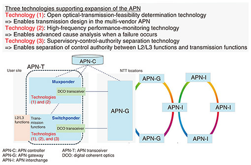 Feature Articles: Technology Development Trends of the IOWN 2.0 Era—From Communications to Computing Vol. 24, No. 4, pp. 38–45, Apr. 2026. https://doi.org/10.53829/ntr202604fa4 Trends in Research and Development of the Latest Transponder Technology Supporting Expansion of APN DomainsAbstractIn the IOWN (Innovative Optical and Wireless Network) 2.0 era, the further expansion of the APN (All-Photonics Network) will require three technologies: open optical-transmission-feasibility determination technology that enables transmission design for multi-vendor networks, high-frequency performance-monitoring technology that enables advanced fault-cause analysis, and supervisory-control-authority separation technology to enable the integration of transmission equipment and routers for installation at user sites. These three technologies are introduced in this article. Keywords: All-Photonics Network, transponder, open optical interface 1. Challenges and initiatives for expanding the APNThe All-Photonics Network (APN) [1] of the Innovative Optical and Wireless Network (IOWN) 2.0 era is expected to be used in a variety of fields, including broadcasting, construction, and manufacturing, and to implement the APN, it is becoming increasingly important to expand the current networks. At the core of the APN, transponders accommodate client signals in the APN, but expanding the APN faces three major challenges. The first challenge concerns transmission design. Multi-vendor solutions are important in terms of avoiding vendor lock-in and optimizing costs. To achieve multi-vendor solutions for transmission equipment, it is not enough simply to implement a standard-compliant interface [2]; instead, it is necessary to devise a system that can determine in advance—from the design stage—whether transmission between equipment from different vendors is possible. The second challenge concerns failure-cause analysis. As the APN expands, networks will increasingly consist of a mix of equipment from multiple vendors. In a network constructed by a single vendor, it is relatively easy to predict expected failure patterns and identify the cause of failures. However, in multi-vendor environments, unexpected failures are more likely to occur, so failure-cause analysis is significantly more difficult. Such failure-cause analysis requires advanced analytical techniques that analyze transponder log information in detail, and that advanced analysis requires frequent monitoring of the optical-signal status. In regard to the conventional interval for monitoring transponders, however, it is challenging to obtain sufficient information for such advanced analysis. The third challenge is the installation of transponders at user sites. Regarding the APN, transponders for accommodating client signals had mainly been installed at NTT locations. However, to make wider use of the APN, it is necessary to be able to connect to the APN from locations close to the user, so it is necessary to install transponders at user sites. Installing transponders in addition to switches and routers at user sites increases the space required for equipment and complicates maintenance and operation. To address this issue, we are investigating a configuration that introduces a “switchponder,” which integrates the layer 2/layer 3 (L2/L3) functions of switches and routers with the transmission functions of a transponder. Although APN service providers want to monitor and control transmission functions, they want users to manage L2/L3 functions. It is thus necessary to implement, within a single switchponder, a mechanism for separating the authority for monitoring and control. The technologies that will solve these three challenges are respectively open optical-transmission-feasibility determination technology, high-frequency performance-monitoring technology, and supervisory-control-authority separation technology (Fig. 1).
