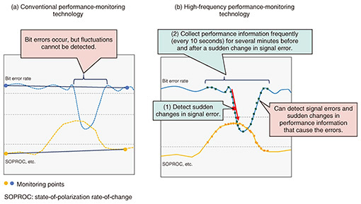 Open optical-transmission-feasibility determination technology consists of two major elemental technologies. The first elemental technology estimates the characteristics of transceivers (APN-Ts). The amount of noise inherent in each transceiver is accurately estimated, and the effect of various noise and waveform distortions on the quality of actual optical signals is measured and modeled. It thus becomes possible, for example, to numerically determine the maximum noise level that will keep the bit error rate within an acceptable range. The second elemental technology (for transmission design) determines whether transmission is possible from estimated transceiver characteristics and line-system characteristics. For each optical path between certain base stations, the parameters of the line system are converted into amounts of signal noise and waveform distortion, and whether the final signal quality (such as bit error rate) is within the acceptable range for the specific in-use transceiver is calculated. To account for equipment degradation and environmental changes over long-term operation, a safety factor (margin) is added to the calculation. On the basis of this safety factor, it is possible to determine whether a candidate APN-T can be used for transmission between specific regions. Open optical-transmission-feasibility determination technology can therefore determine the feasibility of an optical path independently of the vendor by dividing the process into two steps: (i) estimating transceiver characteristics and (ii) creating transmission design on the basis of the characteristics of the transceiver and line system. Operators can thus freely combine equipment from multiple vendors and design and operate stable optical transmission networks. 2.2 High-frequency performance-monitoring technologyAs transponders become more multi-vendor and the APN becomes broader, the risk of intermittent failures, errors that occur for momentarily then disappear, increase. It is difficult to identify the cause of intermittent failures, and there is concern that they will increase on-site maintenance work. With the conventional monitoring technology, the status of the optical signals sent and received by an APN-T is recorded every 15 minutes. This technology is sufficient to understand long-term trends such as aging degradation, but temporary failures that occur for only a few seconds to several dozen seconds often do not show up in the 15-minute snapshot. Therefore, the risk of silent failures, an error occurs momentarily but is not registered in the log, increases. High-frequency performance-monitoring technology was developed to solve this problem (Fig. 3). This technology monitors the status of the APN-T in short intervals, such as every 10 seconds, and when the optical-signal status significantly changes, it intensively records the data before and after that change. It thus becomes possible to track down the signs and causes of failures more accurately.