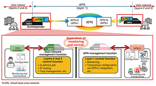 Advances in digital coherent optical technology have led to smaller, more-energy-efficient, and higher-performance transceivers, which can be directly installed in switches and routers as pluggable transceivers. This technology, which integrates dense-wavelength-division multiplexing (DWDM) functionality in routers and switches and connects them directly to an optical network, is called “IP over DWDM.” While a transponder that converts between optical and electrical signals was previously required between routers and transmission equipment, IP over DWDM enables routers and switches to be connected directly to the optical network, thus potentially reducing equipment costs and saving space. Users can also easily connect to the APN by installing transceivers (provided by NTT) in their own routers and switches. One of the reasons that IP over DWDM has attracted attention is the emergence of the OpenZR+ standard. OpenZR+ is a multi-source agreement that integrates the 400ZR standard defined by the Open Internetworking Forum with the open ROADM (reconfigurable optical add/drop multiplexer) functionality, which is widely adopted in optical transmission equipment. It is supported by form factors commonly used in routers and switches, such as QSFP-DD (quad small form-factor pluggable double density) and OSFP (octal small form factor pluggable), and offers flexible data rates from 100 to 400G (providing a reach of up to 600 km for metro-regional applications) and high power efficiency. Currently, 800G OpenZR+-compliant transceivers are available, and hyperscalers and telecommunications carriers are looking to it as a standard that will enable high-capacity, long-distance connections for accommodating the rapid growth in artificial intelligence and cloud traffic. NIC is developing an OCT switchponder that uses a white-box switch; its in-house network operating system (OS), Beluganos [4]; and a 400G OpenZR+-compliant transceiver. Like the OCT muxponder, the OCT switchponder is equipped with functions for open optical-transmission-feasibility determination and high-frequency performance monitoring. It also has a function for separating control authority between the management of Ethernet/IP layers 2 and 3 and the management of APN-T layer 1, so they can be controlled independently. 3.1 Supervisory-control-authority separation technologySupervisory-control-authority separation technology is a function that primarily separates the scope of control over configuration and monitoring of network devices between users and APN service providers (Fig. 5). In conventional optical transmission services, service providers are responsible for optical-path design and operation management in a way that ensures quality. This function enables transceivers to be configured and managed automatically from a controller (APN-C) owned by the APN service provider.