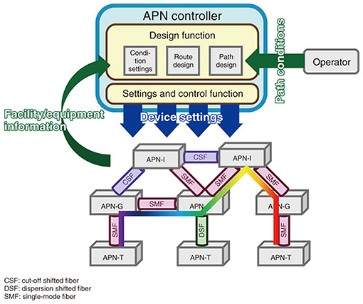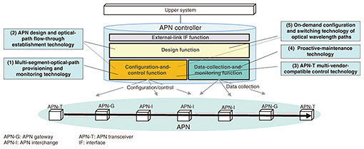 Feature Articles: Technology Development Trends of the IOWN 2.0 Era—From Communications to Computing Vol. 24, No. 4, pp. 46–52, Apr. 2026. https://doi.org/10.53829/ntr202604fa5 Trends in Research and Development of the Latest Controller Technology Supporting Operation of the Evolving APNAbstractThe Innovative Optical and Wireless Network (IOWN) and All-Photonics Network (APN) are evolving rapidly in a manner that achieves even greater capacity, lower latency, and on-demand use, and the role of the APN controller in operating the APN is becoming increasingly important. Five technologies that support the evolving APN, as well as the latest trends in research and development of the APN controller, are introduced in this article. Keywords: IOWN, APN controller, advanced operations 1. IntroductionThe Innovative Optical and Wireless Network (IOWN) and All-Photonics Network (APN) [1] have entered the “APN step2” phase, in which NTT Group companies are successively launching APN services while further evolving IOWN and the APN toward achieving higher capacity, lower latency, and on-demand use. In the January 2024 issue of this journal, we introduced the basic functions of the APN controller, which plays a key role in APN operations [2]. This article delves further into this controller technology by introducing five technologies that support the operation of the evolving APN: (i) multi-segment-optical-path provisioning and monitoring technology, (ii) APN design and optical-path flow-through establishment technology, (iii) APN-T*1 multi-vendor-compatible control technology, (iv) proactive-maintenance technology, and (v) On-demand configuration and switching technology of optical wavelength paths (Fig. 1).