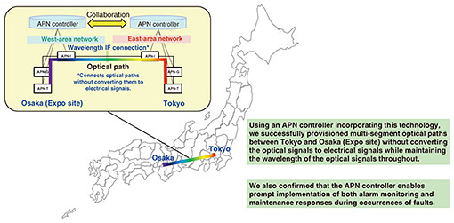 2. Multi-segment-optical-path provisioning and monitoring technologyThe IOWN APN aims to provide high-speed, highly reliable, and low-latency optical paths that span multiple segments. To achieve this, we are advancing research and development of the APN controller function that will enable the provisioning and monitoring of optical paths while coordinating between segments. Commercially available element management system products have functions for provisioning and monitoring optical paths within a single segment; however, they do not have functions for provisioning and monitoring optical paths spanning multiple segments. Focusing on this issue, we are currently studying methods and implementing prototypes for providing three functions: (i) managing network resource information for optical paths spanning multiple segments, (ii) provisioning optical paths in each segment according to network resource information, and (iii) sharing alarms and performance information within each segment. Using an APN controller implementing the above-mentioned technologies, we conducted a field trial in a commercial environment connecting the Expo 2025 Osaka, Kansai, Japan site and Tokyo. This trial demonstrated that it was possible to provide optical paths spanning multiple segments through cooperation between segments and to isolate problems through cooperation between segments. It thus confirmed the feasibility of provisioning and monitoring optical paths spanning segments even in a commercial environment (Fig. 2). We are currently organizing new requirements on the basis of feedback obtained during the trial operation and plan to further improve functionality.