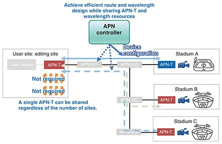 6. On-demand configuration and switching technology of optical wavelength pathsIn addition to supporting the conventional service format in which optical paths are used for long periods under control of an APN controller, we are researching and developing on-demand configuration technology of optical wavelength paths, which enables flexible opening and closing of optical paths in a short period, and on-demand switching technology of optical wavelength paths, which uses common resources to switch the connection destination to the required location flexibly. These combined technologies, called “on-demand configuration and switching technology of optical wavelength paths,” enable economical use of optical wavelength paths on demand according to user needs (including short-term use). The highly reliable, low-latency optical paths of the APN can also be used in use cases in which the connection destination needs to be switched according to the period, such as connections between stadiums and an editing center used for remote production (Fig. 5). Using on-demand configuration and switching technology of optical wavelength paths, the design function unit of an APN controller can automatically calculate routes, wavelengths, transmission quality, etc., which were previously calculated manually. By linking this with optical-path flow-through establishment technology on the basis of design data, it is now possible to automatically carry out the entire flow from design to provisioning on the basis of user requests. In addition to enabling the rapid provision of optical paths on the basis of user requests, it also enables setting up of rapid detours in the event of a major disaster by automatically designing the optimal detour route as the route to which the optical path will be switched.