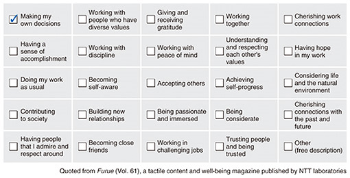 In some cases, students write down what they want to emphasize in events, such as choir competitions, sports days, and school trips, and use this information to foster mutual understanding. It is thought that the process of realizing that different people have different opinions about the same event, understanding differences in values, and acquiring well-being competencies is meaningful for students. This kind of arranged practice also has the effect of deepening connections between teachers across subject boundaries. For example, playing in a musical ensemble and playing in a sports team both lead to acquisition of well-being competencies in the “We” category; as a result, conversations about well-being are progressing even between teachers of different subjects. —You are also applying the concept of well-being to employee engagement in corporations, right? We want to expand the knowledge that we have gained from incorporating well-being in education into various practical areas within a company. A recent topic is our project related to employee engagement in collaboration with NTT’s General Affairs Department. For the annual survey of all NTT Group employees, the Group has adopted questions we developed from a “well-being values” perspective, starting in fiscal 2023 (Fig. 3).