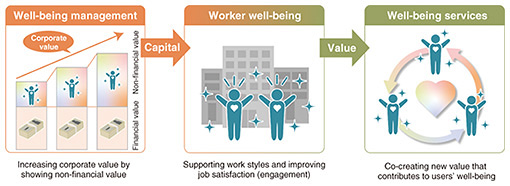 The details of the employee-engagement project are available in Furue online [1], but I’ll present some of the analysis of the survey results. Regarding the NTT Group as a whole, values such as “trusting people and being trusted,” “Giving and receiving gratitude,” and “contributing to society” were ranked highly, and that finding is considered unique to an infrastructure company with a mission to connect the entire country. Within these results, it is clear that not only “I” values related to peace of mind, self-progress, and accomplishment but also “We” values (such as trust and gratitude) and “Society” values (which emphasize contributing to society) tend to increase as the employee’s position rises. It is also clear that when differences by age are focused on, younger employees tend to choose “I” values, while employees in their 50s increasingly choose “We” and “Society” values. These results suggest that it is important to provide younger employees with a place where they can work with peace of mind and opportunities to take on new challenges; in contrast, for older employees and those in higher positions, it is necessary to implement measures that emphasize interpersonal connections and contributing to society. Setting goals, allocating tasks, and engaging in daily communication on the basis of an understanding of each employee’s values is likely to improve employee engagement. We hope to verify these results through tests both within and outside the NTT Group by combining analytical methods with training and other measures to determine how we can increase employee engagement as a company and systematize a methodology for measuring, analyzing, and improving employee engagement on the basis of the well-being of each employee. Expanding our scope to develop services that bring about well-being—Tell us about your future developments. I hope to apply the concept of well-being to not only school education but also corporate management, work styles, and even service development (Fig. 4). In education, NTT Group companies are providing services in line with the Ministry of Education, Culture, Sports, Science and Technology’s GIGA (Global and Innovation Gateway for All) School Initiative. It may be possible to incorporate well-being educational content as added value in communication services. Services are not just about improving the well-being of users; they are also about users and providers creating well-being together. With that point in mind, I believe that applying the well-being concept to service development will be an especially important area from now onwards.