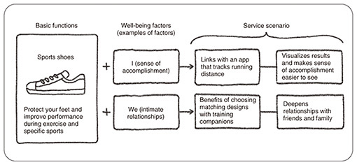 The concept of developing services that contribute to well-being is also compatible with the concept of well-being education. Regarding learning well-being competencies in school education, I touched on “targeted” and “arranged” practices, and that classification can also be applied to service development. Service development sometimes focuses on certain well-being factors, while at other times, well-being experiences can be added on the basic function of improving functionality and productivity. These two types of service development are likely to cover a wide range of service areas. For example, “targeted” service development tends to be suited to services related to mental healthcare, beauty and health, and work styles, while “arranged” service development is thought to be more applicable to materials development and business-to-business businesses. Let us look at some specific examples of the “arranged” service development. For example, the basic function of a product, such as sports shoes, is to “protect the feet and improve performance when playing sports.” If, as an “arranged” service, the product is linked to an app that records the running distance, users will be more likely to feel a sense of accomplishment. Another “arranged” service would be to offer the bonus of being able to choose matching designs with friends who train together, thereby deepen relationships with them (Fig. 5). Even with the same basic functions, the value of the service depends on the well-being that is focused on when the arrangement is made.