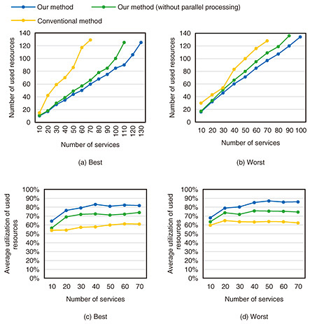 4.1 Random systemFigures 3(a), (b) show the results for the number of used resources and Figures 3(c), (d) illustrate resource utilization for best and worst cases, respectively. To evaluate the impact of the characteristics of heterogeneous computational resources without considering the impact of parallel processing, we also evaluated our method without parallel processing. Compared with the conventional method, our method decreased the number of resources by an average of 20 to 46% and increased the average resource utilization by an average of 16 to 20%. The difference arises from whether the characteristics of heterogeneous computational resources are accounted for. The conventional method without parallel processing struggles to allocate suitable resources, leading to lower performance and the need for additional resources. In contrast, our method effectively matches resources to VFRs, reducing the number of resources. It also improves resource utilization by accounting for the provisional utilization of resources on the basis of the impact of the characteristics of heterogeneous computational resources. Compared with the conventional method, our method with parallel processing decreased the number of resources by an average of 28 to 51% and increased the average resource utilization by an average of 29 to 35%. These results indicate that our method can further increase resource utilization and decrease the number of resources with parallel processing. The above findings clarify the importance of accounting for the characteristics of heterogeneous resources and parallel processing to maximize resource efficiency and utilization. 4.2 Realistic systemFigures 4(a), (b) show the results for the number of used resources and Figures 4(c), (d) illustrate resource utilization for best and worst cases, respectively. We evaluated the effectiveness of our method in practical cases. Compared with the conventional method, our method decreased the number of resources by an average of 41 to 49% and increased the average resource utilization by an average of 16 to 22%. These results indicate that our method will be beneficial in real-world environments. 4.3 RuntimeFigure 5 shows the distribution of the average allocation times for the 20 services in the random system, grouped by the number of services placed in the system. For each group, the box plot represents the variability of allocation time across different parameter settings, while the triangle marker indicates the average allocation time for each case. The results indicate that our method can allocate resources in all cases within ten seconds per service on average, which is considered acceptable for resource allocation before service execution. Although some variation in allocation time can be observed across different service groups, no clear increasing trend is observed as the number of placed services increases. This indicates that system usage has no effect on resource allocation time, even when the overall utilization of the system is high. These findings suggest that our method executes stable resource allocation regardless of system usage.