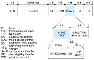 2.1 High-bit-rate and long-distance interfacesEthernet interfaces for bit rates of up to 10 Gbit/s and transmission distances of up to 40 km were standardized by IEEE 802.3ae in 2002. With this standard, Ethernet became a viable option for high-speed and long-distance transmission in carrier networks such as SDH (synchronous digital hierarchy) and OTN (optical transport network). In addition, standardization of 40- and 100-Gbit/s interfaces has started in a new project, IEEE 802.3ba, based on the results of HSSG (Higher Speed Study Group) within IEEE 802.3. The objectives indicate that a transmission distance of 100 m will be supported for 40-Gbit/s interfaces and 40 km will be supported for 100-Gbit/s interfaces. In addition, this standard is expected to support OTN, which can be used for long-distance transmission. Thus, ultrahigh-speed and long-distance transmission technologies are expected with this standard. 2.2 Capability enhancement as access networksEFM (Ethernet in the First Mile) was standardized by IEEE 802.3ah in 2004. This standard provides 1-Gbit/s EPON (Ethernet passive optical network) and OAM capabilities for access networks. EPON enables efficient use of optical fibers by sharing an optical fiber among multiple (e.g., 16) customers. The OAM functions allow efficient operation of access networks. In addition, standardization of 10-Gbit/s EPON has been started by IEEE 802.3av to accommodate the increasing traffic demand. 2.3 Enhancement of VLAN scalabilityVLAN was standardized by IEEE 802.1Q. This technology allows logically separate LANs to be defined on a physical Ethernet. Initially, it was assumed that VLANs would be used in enterprise networks. When this technology was applied to carrier networks, both customers and carriers required the capability to define VLANs independently of each other. Provider Bridges were standardized by IEEE 802.1ad in 2005 to meet this requirement. Two sets of VLAN tags are used so that customers and carriers can define a C-VLAN (customer VLAN) and an S-VLAN (service VLAN), respectively. To support even larger-scale networks, Provider Backbone Bridges are under development by IEEE 802.1ah. In addition to the C-tag, this technology uses an I-tag, which includes a 24-bit service identifier, and a B-tag, which defines the backbone VLAN. In IEEE 802.1ad, an S-tag is used for both service identification and VLAN definition. The role of the S-tag was divided into I-Tag and B-Tag for greater scalability in IEEE 802.1ah. It is now under Working Group Ballot, which is the final approval process at the Working Group level. The frame formats of IEEE 802.1ad and IEEE 802.1ah are shown in Figs. 1 and 2, respectively. Both IEEE 802.1ad and 802.1ah use multiple VLAN tags that have the same structure to obtain greater VLAN scalability while maintaining compatibility. This method allows existing switches to be used in the network core while new functions are provided by edge switches.