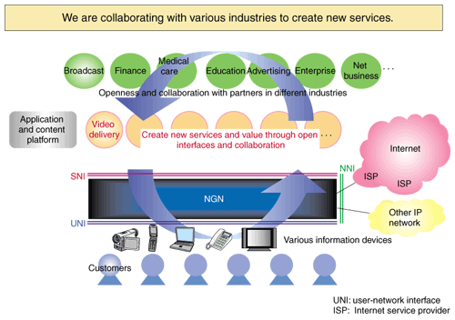 3.2 Network services provided on the NGNWe provide both best-effort services, such as Internet access, and guaranteed-bandwidth services, such as telephone services, on a single network. Since the new services can guarantee QoS, it will become possible to provide high-quality IP phone and videophone services and IP retransmission of digital terrestrial broadcasting. 3.3 Creation of new services on the NGNWe are emphasizing openness and collaboration in supporting service creation and we are accordingly working with partners from a wide variety of industries (Fig. 7). In particular, we consider that a key to having the NGN used as the basis for various services is the interface between an application server and the network (SNI), which provides interconnection between the NGN and servers of content or service providers.