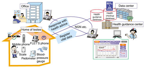 From April 2008, health insurance providers will be required to provide specific health checkups and specific health guidance. People whose checkup results indicate that they are suffering from or likely to suffer from metabolic syndrome will receive health guidance. At present, the number of nurses is painfully inadequate for the number of persons requiring health guidance. Therefore, ICT systems that can increase the efficiency of health guidance are badly needed. At present, the NTT Group is carrying out a joint trial with Nakatsugawa City in Gifu Prefecture. In this trial, a nurse initially has a face-to-face interview with the patient, but from the second consultation onwards, he or she provides remote health guidance to the patient at home via a personal computer or a FLET'S phone. The patient registers his or her vital data, such as blood pressure, weight, and pedometer reading into the center's database by using a mobile phone or other device. The nurse can provide effective health guidance by referring to the patient's data in the database during a remote health guidance session. 5. NTT Group's R&D5.1 NTT R&D Laboratories' contributions to the NGN and other projectsPeople often ask me why NTT needs R&D laboratories, or tell me that few carriers in the world have R&D laboratories. NTT's Laboratories has been playing an enormous role in developing the NGN and enabling greater access to broadband services. (1) Construction of a safe and secure NGN To construct a safe and secure network, one must be able to look at the network from a wide perspective, including network operations. NTT Laboratories has contributed to making the NGN a reality by developing technologies needed for providing safe and secure services, such as technologies for guaranteeing end-to-end quality and controlling congestion (total optimization). Telecommunication networks are built using technologies from multiple vendors. The R&D team has also contributed to the implementation of a stable network by testing interoperability between different equipment (supporting a multivendor environment). (2) Development of technologies that support optical access (FTTH) NTT has been developing technologies for optical access and providing a FTTH service for about 20 years. For example, in order to achieve high-speed and economical optical broadband access, NTT Laboratories has developed optical transmission technologies and equipment, such as the gigabit Ethernet passive optical network (GE-PON). In addition, in order to reduce the time and cost of installation and the amount of testing prior to service provisioning to individual customers, it has developed free-bending optical cords and optical connectors, which enable optical fibers to be connected without any special tools. (3) Contributions to new service creation NTT Laboratories has been contributing to new service creation as well. For example, with a view to making the retransmission of digital terrestrial broadcasting technically feasible, it has developed LSI (large-scale integrated circuit) chips and transcoding equipment that converts digital terrestrial videos into the H.264 format, which supports a higher compression rate. It has also contributed to the development of IPTV standards. 5.2 Future R&D activities(1) Promotion of R&D for the full-scale deployment of the NGN To ensure further development of the NGN, we will continue to push forward with our R&D work on the expansion and functional enhancement of network services and on the creation of services that truly benefit from the newly available features of the NGN. (2) Promotion of initiatives that convert R&D results into business In addition to using R&D results within the NTT Group, we will strive to create new markets from our leading-edge technologies. (3) Promotion of basic and elemental technologies that support our growth strategies We will continue with basic research designed to build potential for future information communications. (4) Strengthening of international competitiveness and global application of R&D results We will seek global application of the technologies and products we have developed in the areas of optical access and the NGN, thereby helping to strengthen Japan's international competitiveness. 6. NTT Group's future activitiesFinally, let me talk about the future activities of the NTT Group. With our leading-edge R&D as a driving force, we will continue to discharge our responsibilities as a carrier that provides safe and secure network services. At the same time, we will not stop at being a simple carrier but will strive to become a service-creating enterprise by focusing on the following areas.