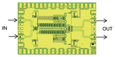 A photograph of the fabricated IC chip is shown in Fig. 4. A fully differential configuration was used for connection with the dual-PD and to stabilize performance against device fluctuation. The chip size is 2×2 mm2 and the power consumption is 0.6 W. The 3-dB bandwidth is 19 GHz and the differential gain is as high as 34 dB. The group delay deviation is only ±10 ps. A balanced photoreceiver module was fabricated by using the TIA/AGC IC and a dual-PD, which integrates two maximized induced current photodiodes (MIC-PDs) [4] and provides a high 3-dB bandwidth of 25 GHz and high responsivity of about 1 A/W.
